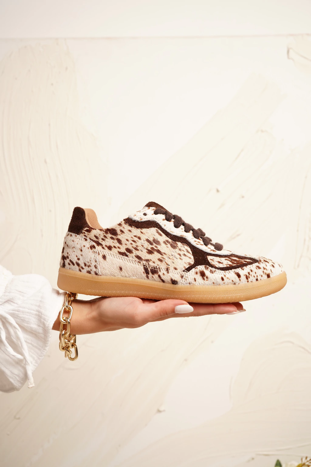Las zapatillas Aloha estan diseñadas en cuero con acabado de pelo estilo piel de vaca en tono camel. Diseño de estilo corte bajo, sobre una suela de goma rugosa y plantilla anatómica, se completan con detalles clásicos, incluyendo costuras visibles.