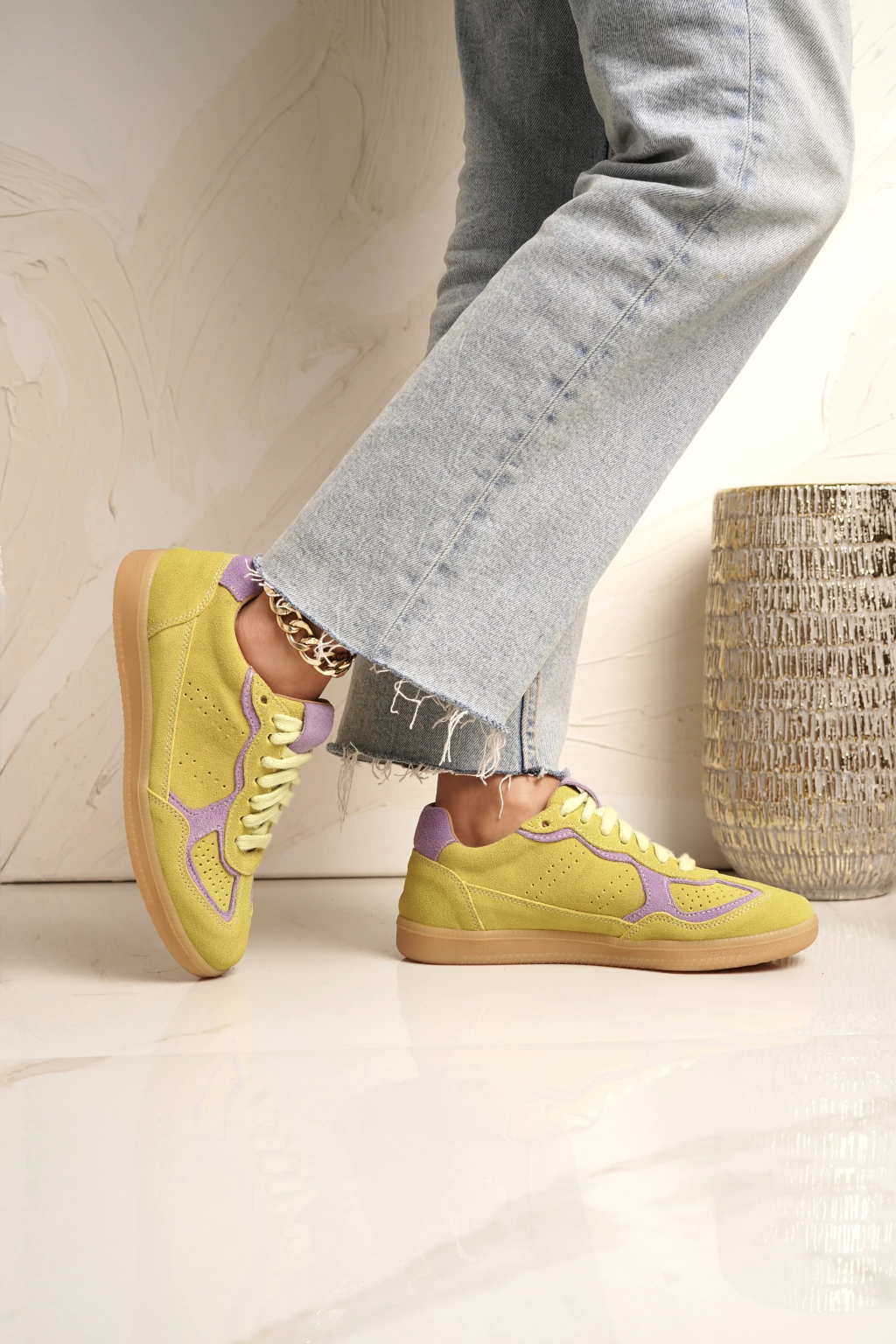 Las zapatillas Aloha Lima estan diseñadas en gamuza vacuna, tono verde lima con detalles en contraste color lila.. Asentadas sobre una suela de goma rugosa y plantilla anatómica, se completan con detalles clásicos, incluyendo costuras visibles.