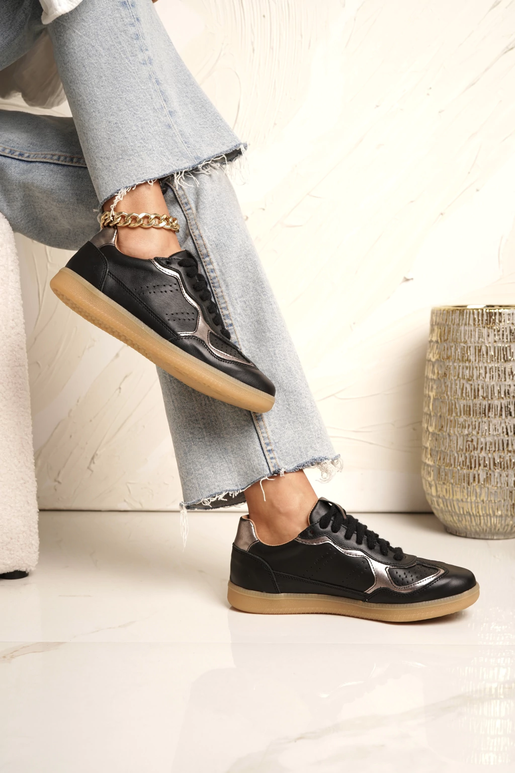 La zapatilla Aloha está confeccionada en cuero vacuno color negro con detalles en color peltre para un contraste sutil. Los cordones de algodón color negro neutralizan esta combinación. La silueta de caña baja se asienta sobre suela de goma marrón con plantilla anatómica, con costuras destacadas a lo largo del perfil