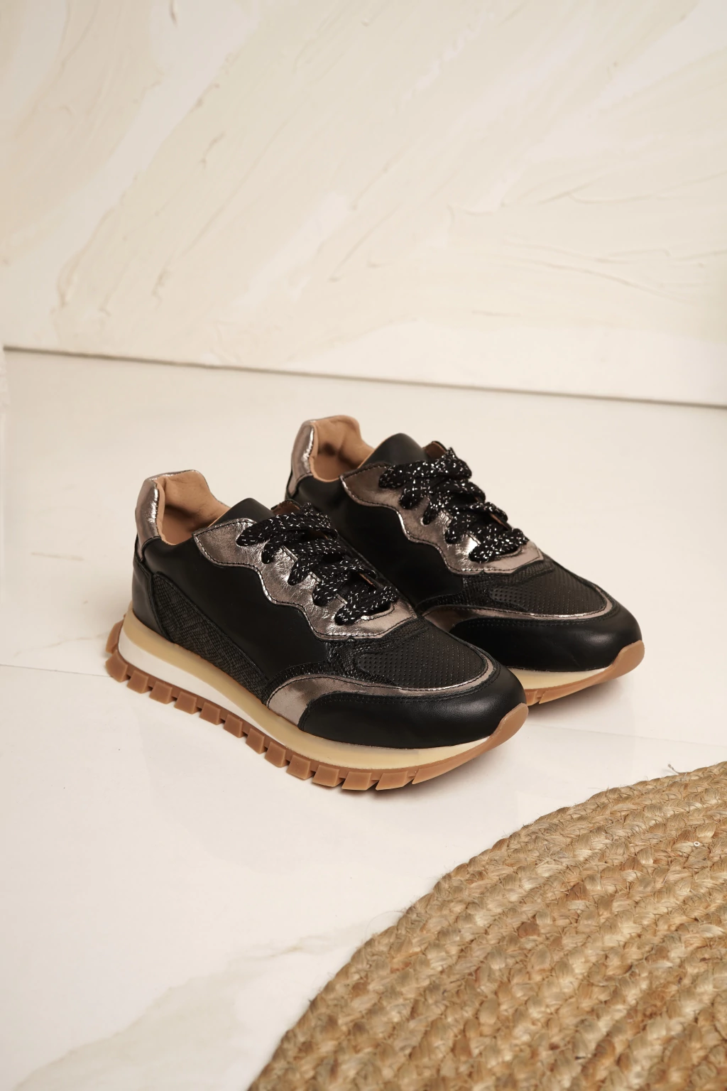Su plataforma mediana de goma realza tu figura sin perder confort, ideal para acompañarte todo el día. Los cordones de lurex aseguran un ajuste firme y natural, sumando un detalle artesanal que completa su diseño exclusivo.