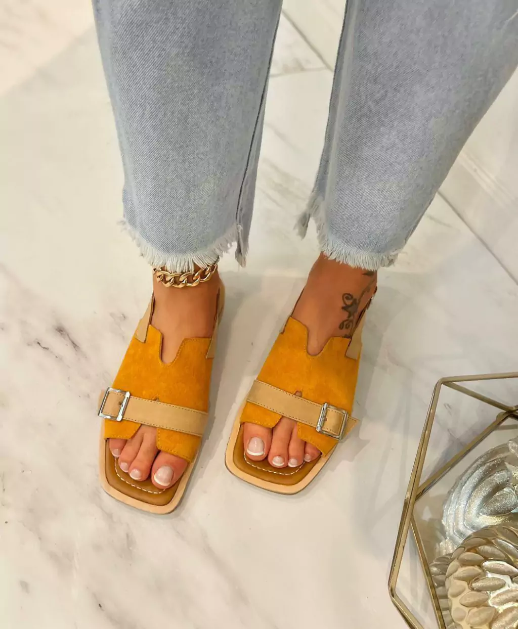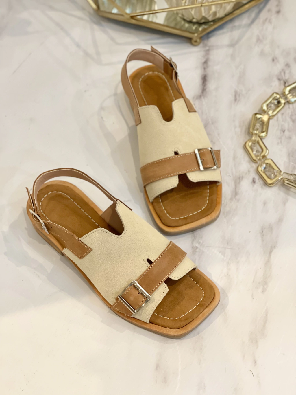 Sandalias flat con detalle de caladuras en bordes y cintos con hebilla. Agarre de pulsera regulable. Plantilla confort forrada a tono y capellada de cuero vacuno. La suela es de goma tr anti deslizante. Este diseño propone un equilibrio perfecto entre lo sofisticado y moderno.