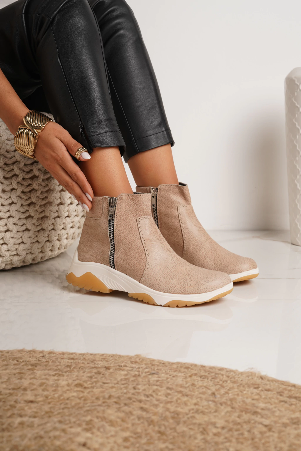 Cómodas y atemporales nuestras sneakers Miranda le dan un toque de modernidad a las clásicas botas con cierre. Confeccionados en cuero vacuno graneado y base de goma con pisada color crepe. Este diseño condensa un estilo contemporáneo y sofisticado.